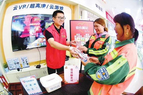 中国电信江苏淮安分公司清江浦区营业厅“爱心驿站”休息区向户外工作者提供了千兆宽带、高清电视、手机加油站、智能手机应用辅导、手机美容等服务项目。7月10日,“爱心驿站”党员志愿者为户外环卫工人送上清凉矿泉水。