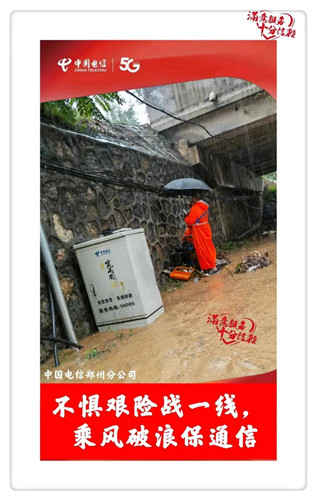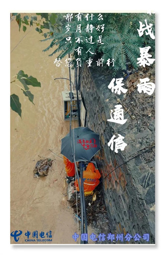 郑州电信维护人员不惧艰险,正在全力抢险!郑州电信服务厅提供雨伞等应急设备,免费提供进厅休息等暖心服务!百倍努力,只为换您“10”分满意!感谢您的理解和支持!