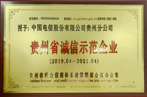 中国电信股份有限公司贵州分公司被评为贵州省诚信示范企业