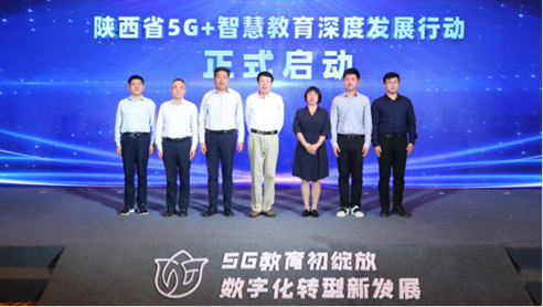 电信终端产业协会秘书长谢毅、陕西省教育厅信息化处处长李享阳、陕西省通信管理局信息通信发展处副处长刘萍、西北工业大学信息化建设与管理处处长薛静、西安高新第一中学副校长刘江涛、中国电信陕西公司总经理助理辛公良、中国电信集团教育行业事业部副总裁赵添乘共同启动“陕西省5G+智慧教育深度发展行动“。