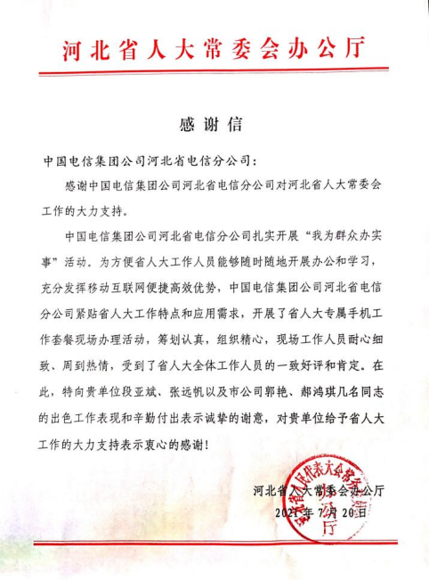 正是将诚实守信、依法经营作为各项工作的基本行为准则,秉着这样的理念,多次获得河北省人大常委会办公厅、省人民政府参事室等政府部门感谢信。我们将一直致力于诚信工作,以实际行动为公司发展注入更多正能量。
