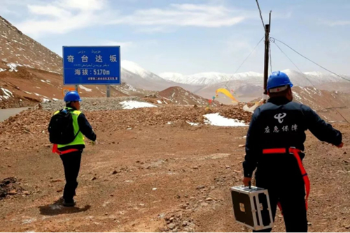 千里新藏线,巍巍昆仑山!随着车辆继续向喀喇昆仑的深处开去,记者也体会到了冰雪的威力和昆仑山上的威严。“要在世界上海拔最高的公路上开通基站,真的要解决很多难题,这里不可控的因素太多,天气每小时都在发生变化。为高寒地区立起一个无线基站,连自己的身体活动都成了问题需要去克服。有时基站上接光缆突遇刮风下雪,需要几个人围在一起给操作人员挡雪、以防严寒一个人坚持不住还要大家轮流换着作业。”师亚峰给我们介绍道。每年十二月份到来年的二月份,都是新藏线上氧气最稀薄的时段,师亚峰和团队经常在冬季冒着近零下30摄氏度的严寒和狂风,开车上山,检修维护。到达修建基站的山脚下时,因为海拔太高,大家都尽量把车开到离基站最近的地方。调为四驱,踩足油门,一辆不大的黄色越野车,就这样在海拔4000多米的地方曲折前行。到了车不能走的地方时,他们就扛着设备与脚扣,徒步十几分钟,到达山顶,这也是每次基站抢修与维护的常态。检修完三分之一的基站之后,天色将暗,师亚峰说,这可能又是一个他要睡在山上的春节了。
