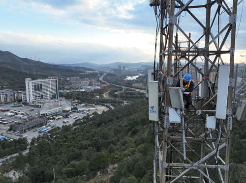 在湖南郴州,无线运营工程师登上京港澳高速郴州路段旁的铁塔调测基站天线,进行5G网络优化,让返乡之路更安心。
