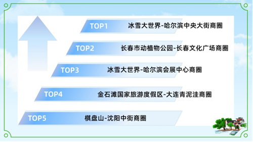 到访景区的人中有55.6%的游客到访了东北当地的主要商圈,其中以冰雪大世界-哈尔滨中央大街的线路最为热门。目标为乡村游的游客对于东北城市商圈经济的消费拉动作用也尤为明显。