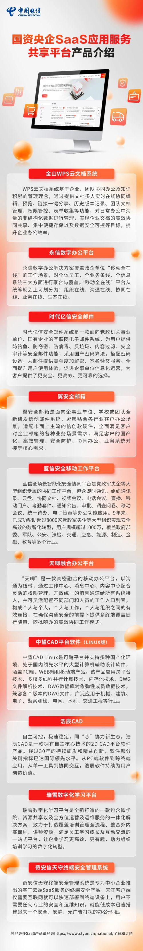 在国资委指导下,中国电信建设了“国资央企SaaS应用服务共享平台”,服务国资央企信息化建设模式创新、安全保障能力提升和软件正版化等工作协同推进。平台以中国电信天翼云为底座,已完成流式办公软件、专业软件、安全移动工作平台等20余款基础通用类软件SaaS化部署,为国资央企提供高效、安全的一站式应用上云服务,构建安全体系新格局。